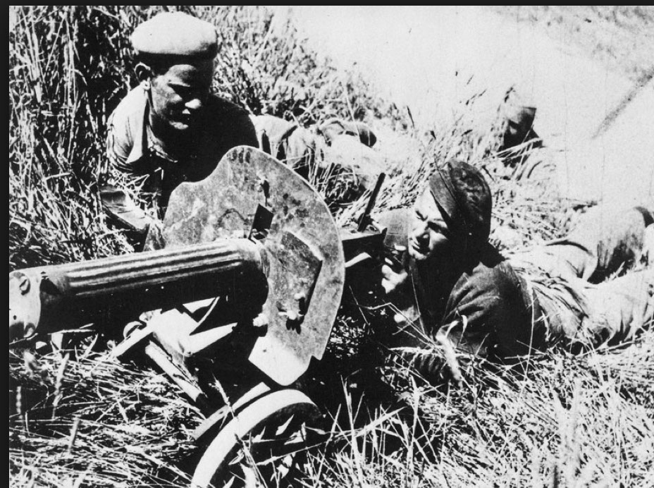 I sat at our Krupp version of an eight-bore Gatling gun that we aimed down the Paseo, the lower Ramblas at Plaza Colon. I could see the whole street. Barricades were up and there was fighting below.